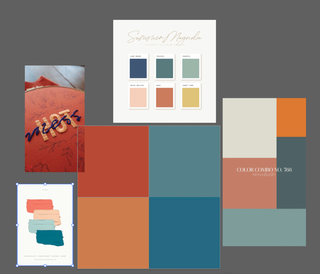 Jen had some color suggestions and a general design aesthetic in mind. She wanted to incorporate reds and blues together to show the interplay of shame and grace through color theory. The photos I was shown was the “hot mess” embroidery photo on the left of the color palette block. I found some other color inspiration in the photos around the edges, then created a color palette based on the inspiration photo for the colors to blend better together and have appropriate contrast and saturation together. The red, orange, and blue color block shown in the center of this screenshot is the final color palette.