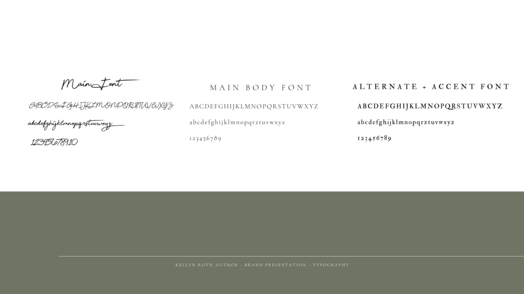 Kellyn already used a main script font, and used a serif font similar to the Cormorant Garamond Thin I added to her brand fonts. The alternate header font was added to provide contrast to the formal Cormorant font and further develops the rustic feel in a professional way.
