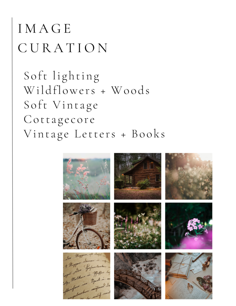 Creating an image style was one of my favorite parts of the project. Using both her design style and brand Pinterest board, I was able to find stock photography that beautifully reflected a cottagecore and vintage look. I gave her general image guidelines and subject ideas, along with two curated folders of free stock photography images.