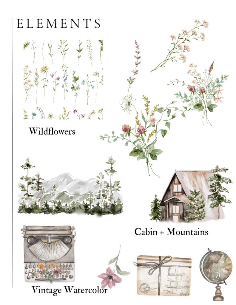 As far as elements, I knew from another project with Kellyn that she liked watercolor elements. From her request for a “cottagecore” and “feminine” vibe, along with her brand Pinterest board, we incorporated wildflowers into her elements and photography collections. I also incorporated some vintage elements and cabin and forest mountains clip art, to really bring her rustic cabin aesthetic to life and pair that with things that reflect her historical fiction genre.