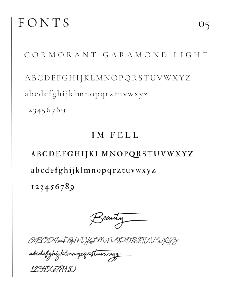 Kellyn already used a main script font, and used a serif font similar to the Cormorant Garamond Thin I added to her brand fonts. The alternate header font was added to provide contrast to the formal Cormorant font and further develops the rustic feel in a professional way.