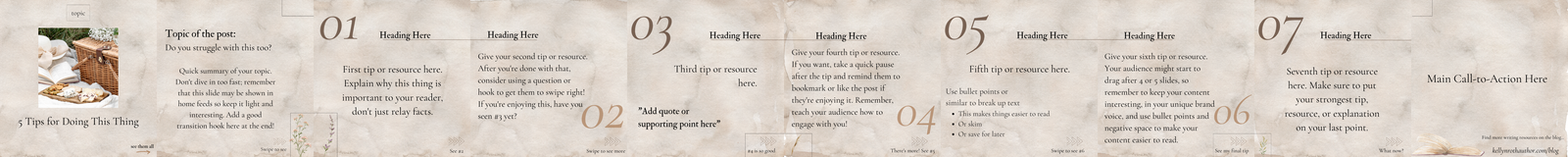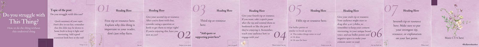 For the final piece of the project, I created a dual-color carousel template for Kellyn to use in her informational posts. She creates a lot of longer-form content, both about her books and content to teach writers. I designed these templates so she would have a clear and on-brand way to share this content, as well as helping her get the higher post engagement rates that carousels often offer content creators.