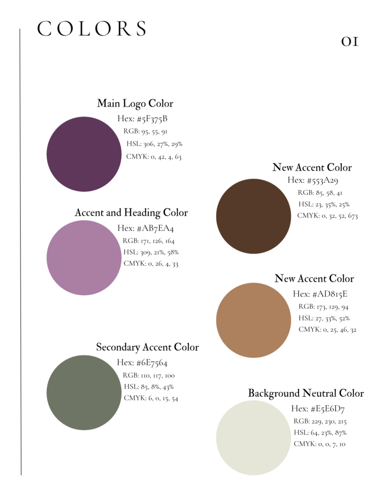 Kellyn had some color suggestions and a general design aesthetic in mind. She already had two purple colors in use on her website and graphics, and wanted to incorporate more of a rustic color palette that would meld well together with current image colors and the purple brand colors. She was wanting particularly to add a brown and green color, and had tried to in the past. I added two browns that I felt really captured a homey cabin feel, as well as a pastel dark green that tied in well with both rustic vibes and played beautifully with the lilac colors. The light grey served as a good neutral, and includes a hint of sage so it will look good as a background.