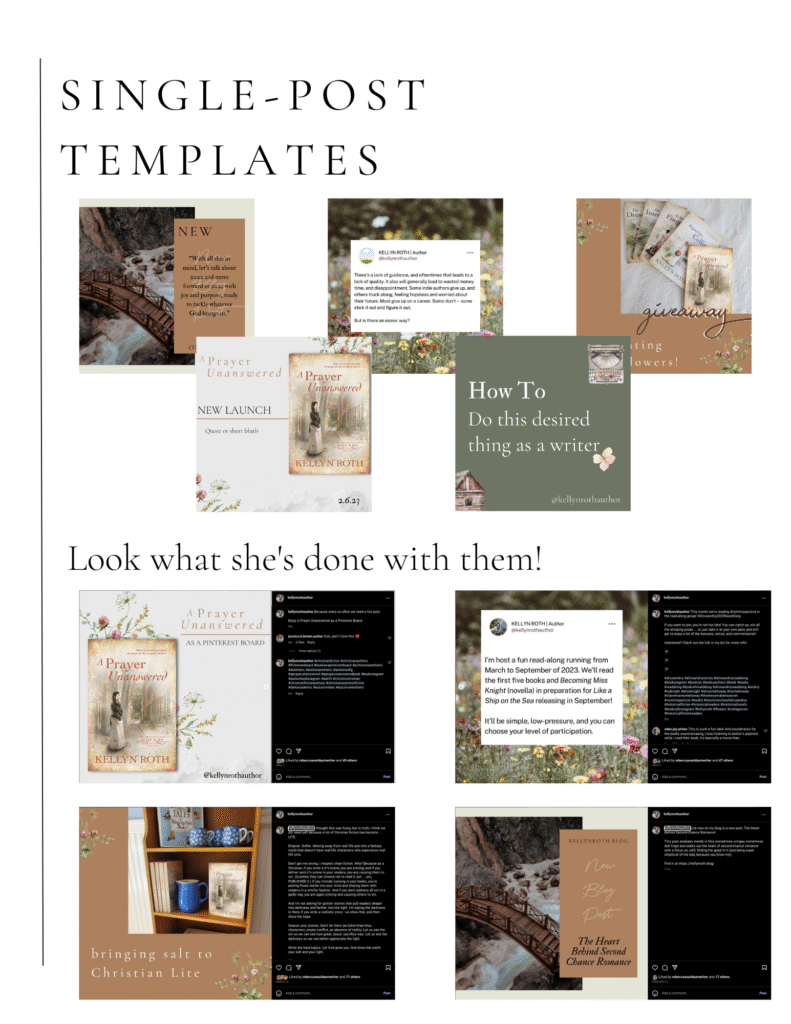 To create cohesive branding for Kellyn Roth’s author Instagram profile, and then develop that branding into easy-to-use Canva templates for her to edit and use regularly in her posts.