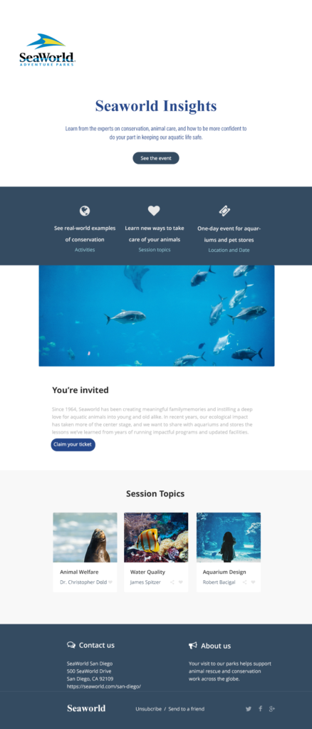 SeaWorld will be advertising specifically to the businesses we specifically want to attend this event. There will be an email newsletter sent out to all the businesses that are subscribed to our existing email lists and segmented as similar aquariums interested in training.